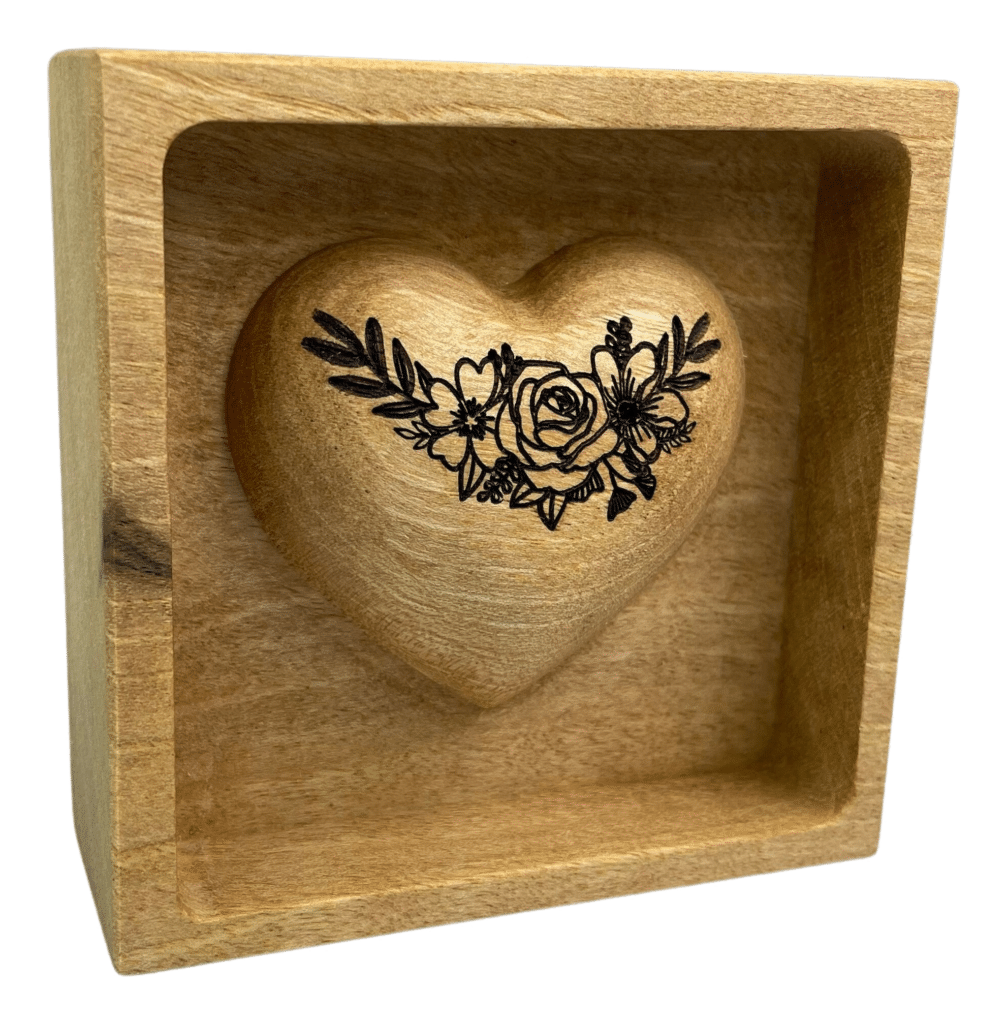 Erinnerungsstück aus Walnussholz, Herz mit einer Rosengravur, unbehandelt, naturbelassen
